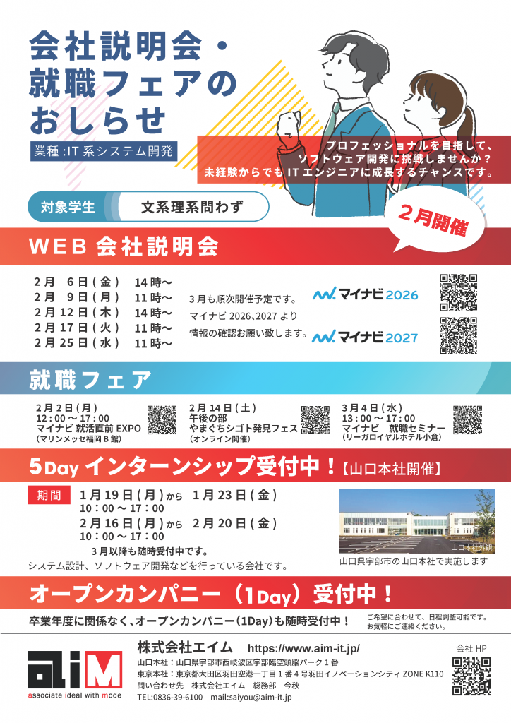 2026.01.16 ニュース エイムでは、下記内容で会社説明会やインターシップを受け付けています。 問合せや申し込みは、マイナビ2026・マイナビ2027から、もしくは会社へお問合せ下さい。 ※随時更新いたします。 お知らせ一覧へ
