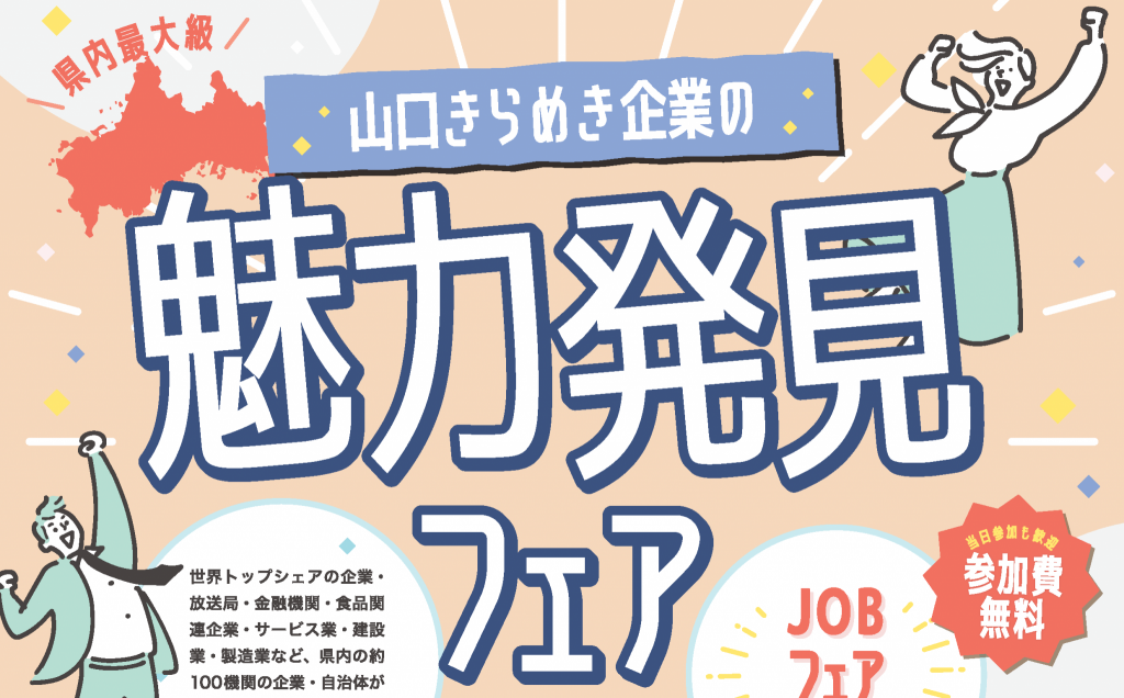 大学生等が県内の魅力ある企業等を発見し、理解を深めることにより、若者の県内就職に繋げることを目的とした「山口きらめき企業の魅力発見フェア(Jobフェア)」を出展します。